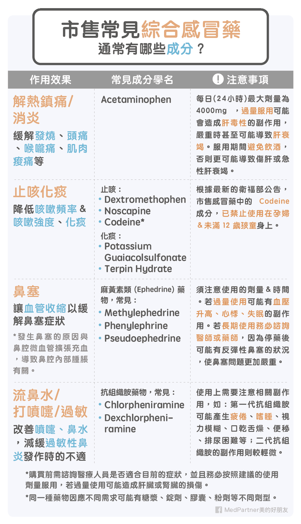 許多人會想進一步了解市售常見的綜合感冒藥到底有哪些成分?不同成分、劑型的感冒藥到底該如何選擇?今天 Medpartner 團隊的醫師和藥師將帶你一起來認識常見的綜合感冒藥,分析常見的感冒藥成分,並完整介紹使用時的注意事項。文末我們還附上了完整的綜合感冒藥的整理表格,幫助你更清楚分辨每個藥物的效用,作為選購感冒藥時的參考。準備好了嗎?我們開始上課囉!