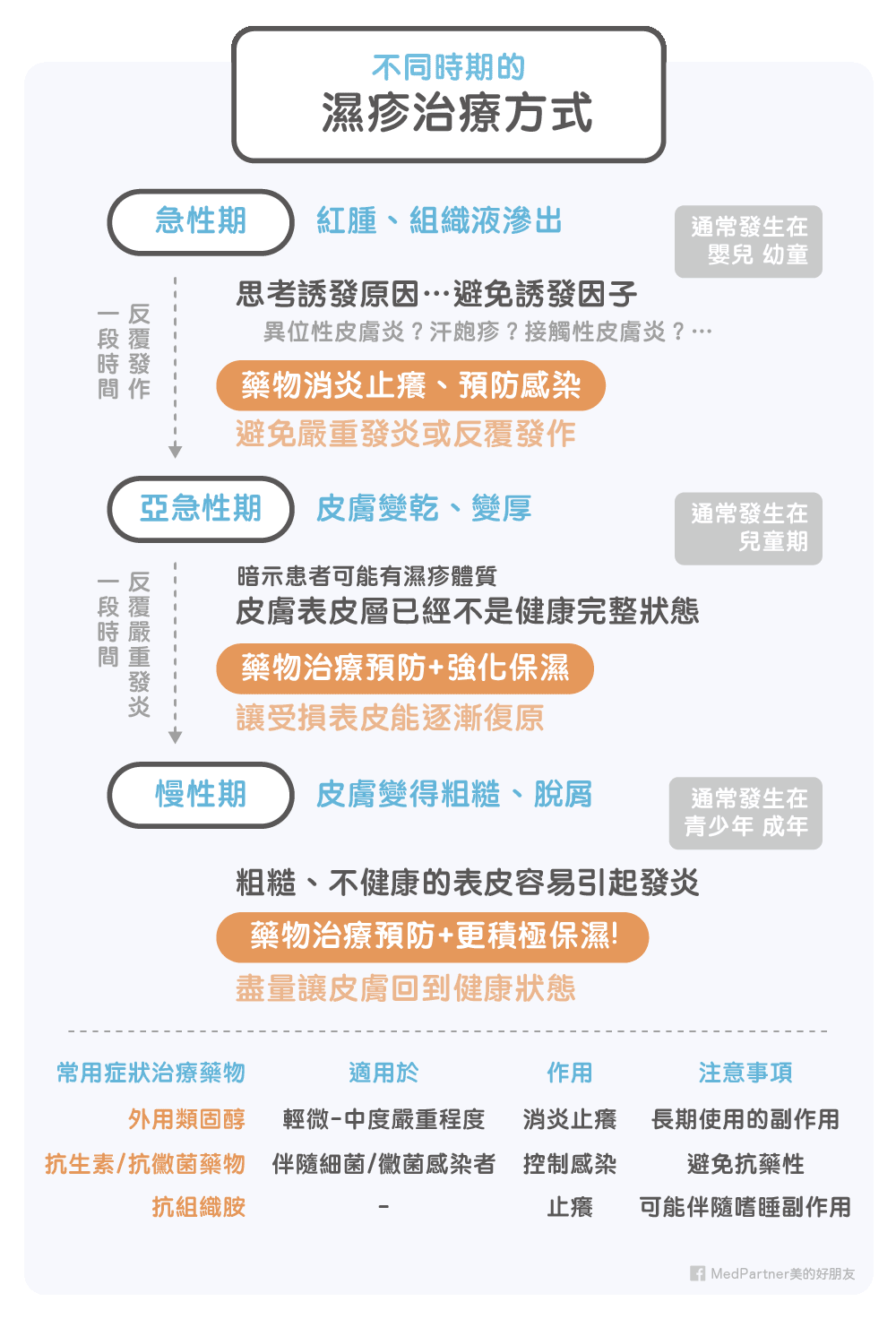 濕疹這種變化多端的疾病,醫師不只是要「對症下藥」,還要思考到更源頭的誘發因子,以及想辦法預防持續惡化等許多面向。在不同時期的濕疹可能代表不同的成因、不同的症狀,自然會有不同的治療方式。