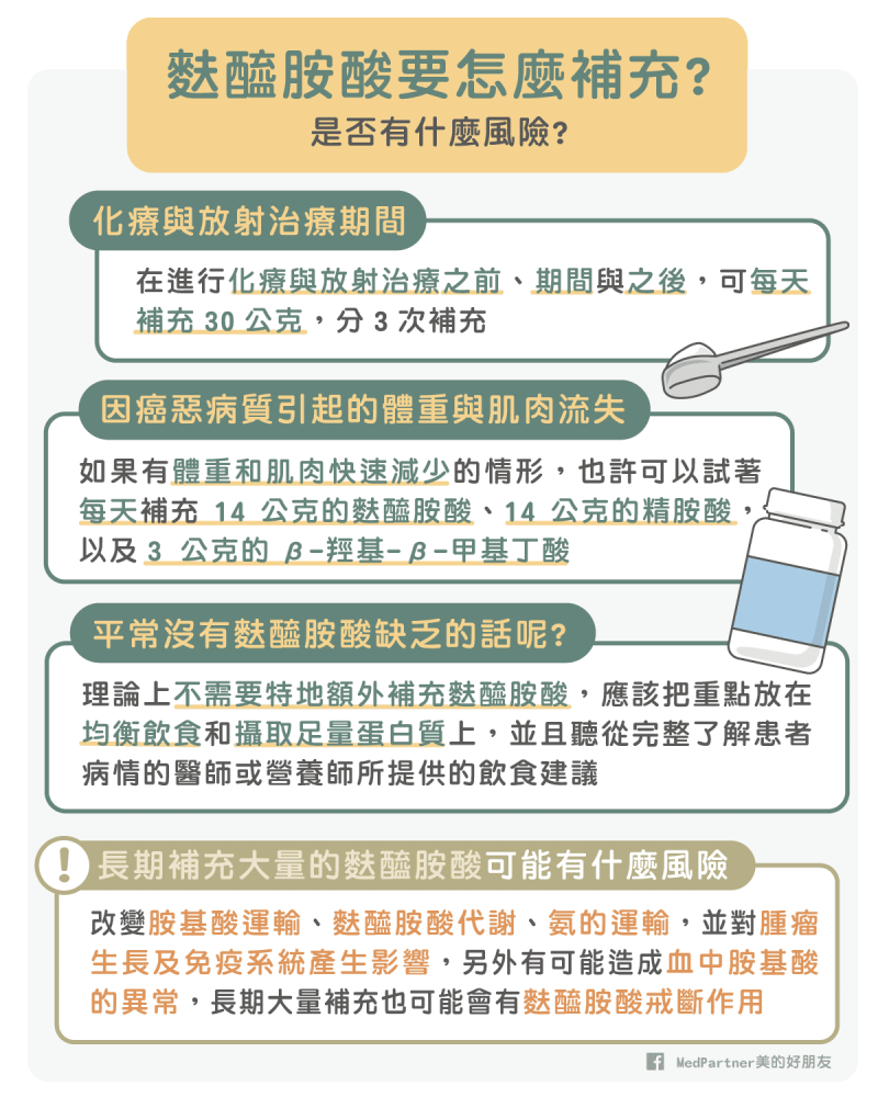 因癌惡病質引起的體重與肌肉流失:每天建議補充 14 公克的麩醯氨酸、 14 公克的精胺酸,以及 3 公克的 β-羥基-β-甲基丁酸。 - 麩醯胺酸過度補充有什麼問題?