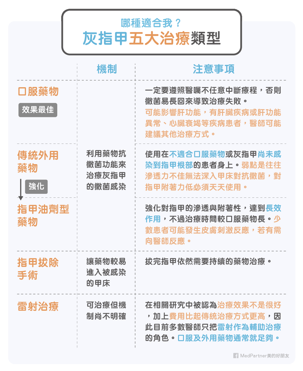 目前灰指甲的治療方式大致上可分為:口服藥物、傳統外用藥物、指甲油劑型藥物、指甲拔除手術、雷射治療等五大類,每種治療都各有優點,也有各自的侷限,醫師會綜合考量患者的狀況給予適當的建議。