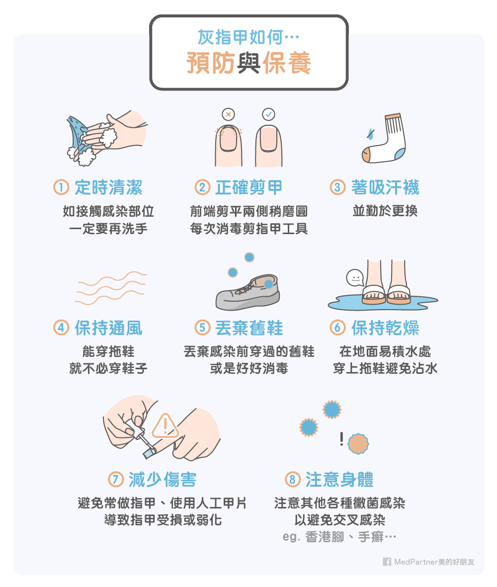 灰指甲的保養與預防,一切還是要回到灰指甲的「致病機轉」。灰指甲就是指甲的黴菌感染,所以只要能讓指甲不容易發霉的方式,就是好的預防方式!怎麼樣讓黴菌不容易長呢?保持乾燥、避免接觸可能的感染源、避免指甲受傷,以上就是預防灰指甲的三大心法。這樣講可能不夠具體,我們把相關注意事項條列如下:
