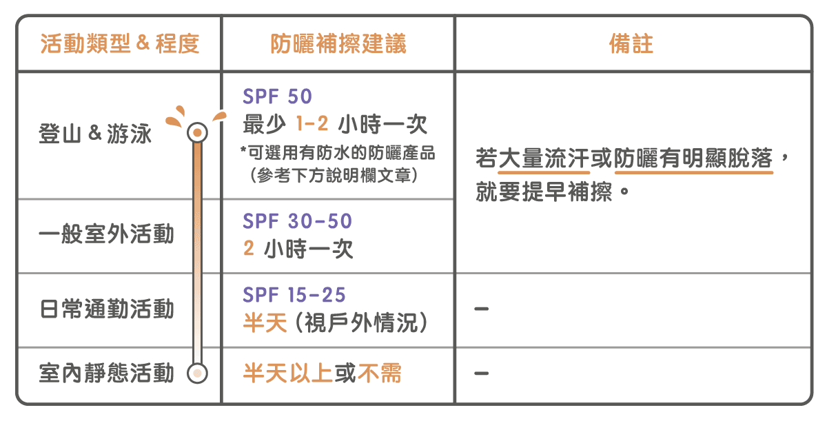 為了讓防曬不只是擦心安的,我們會建議如果你進行在戶外會流汗的活動,盡量一兩個小時就需要補擦一次,防護力才會完整。而如果待在室內居多,而且大多時間進行靜態活動,也許半天再補一次就足夠,例如中午出門買飯的時候。如果是比較辛苦的上班族朋友們,離開辦公室都已經晚上了,那也就不必再補擦囉。
