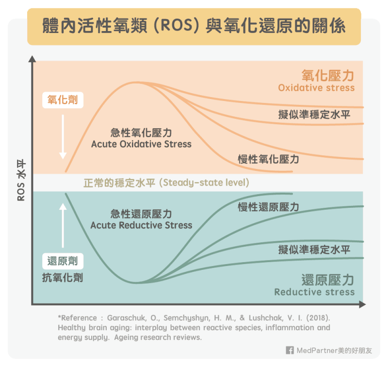什麼是氧化還原平衡呢?理想的情況是讓細胞內的氧化作用和還原作用,這兩個體內隨時都在發生的作用,維持著相互抗衡的狀態( Steady-state level ),但隨著年齡的增加或是外在的因素,例如飲食失衡、環境壓力…等,這個平衡會往氧化的這邊傾斜,也就是所謂的氧化壓力(氧化力強過抗氧化/還原力)。長期下來會逐漸影響細胞功能,並可能影響身體的健康。反之,如果細胞內的抗氧化能力大於氧化,稱為還原壓力。