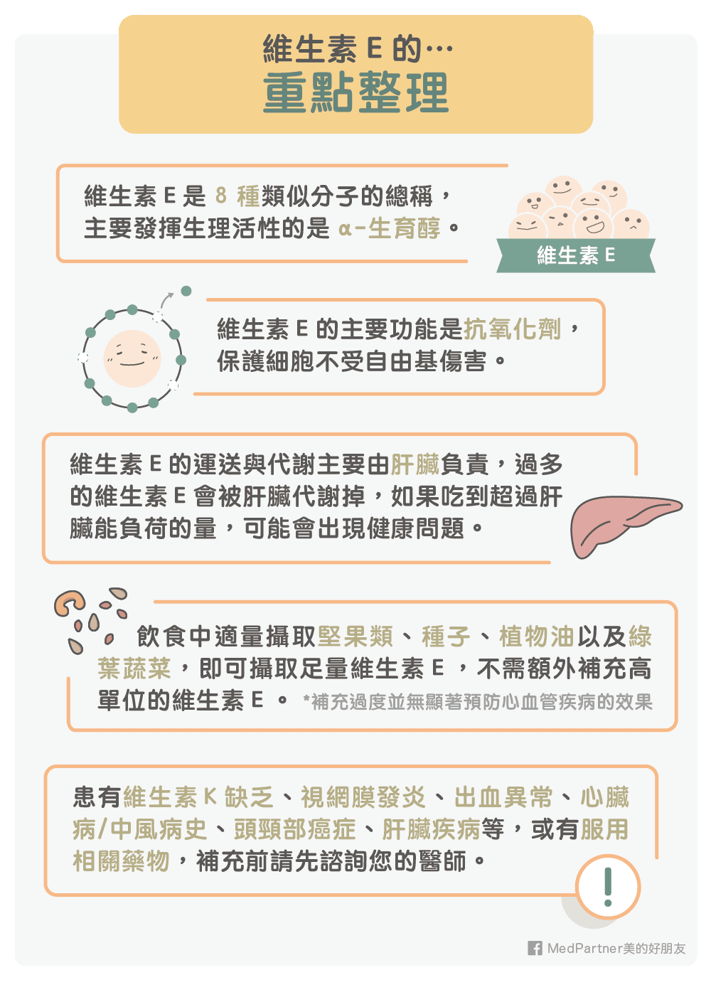 總結下來,只要日常飲食裡注意植物油、堅果類等食物的攝取,我們很容易就可以吃到足夠的維他命E 。就現有的證據,人們其實不需為了促進健康,而去補充高單位的維他命E喔!希望這篇文章能幫助你更認識維他命E 是個什麼樣的營養素。